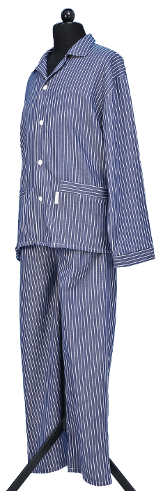 Aus der Schneiderei in der JVA Luckau-Duben kommt ein Schlafanzug im blaugrau-weiß-gestreiften Knastlook in den Größen S bis XXL für 25 Euro. Mit zwei Jackentaschen und verstärkten Manschetten. Material: Baumwolle/Schlosserflanell. Kochfest 95 Grad.